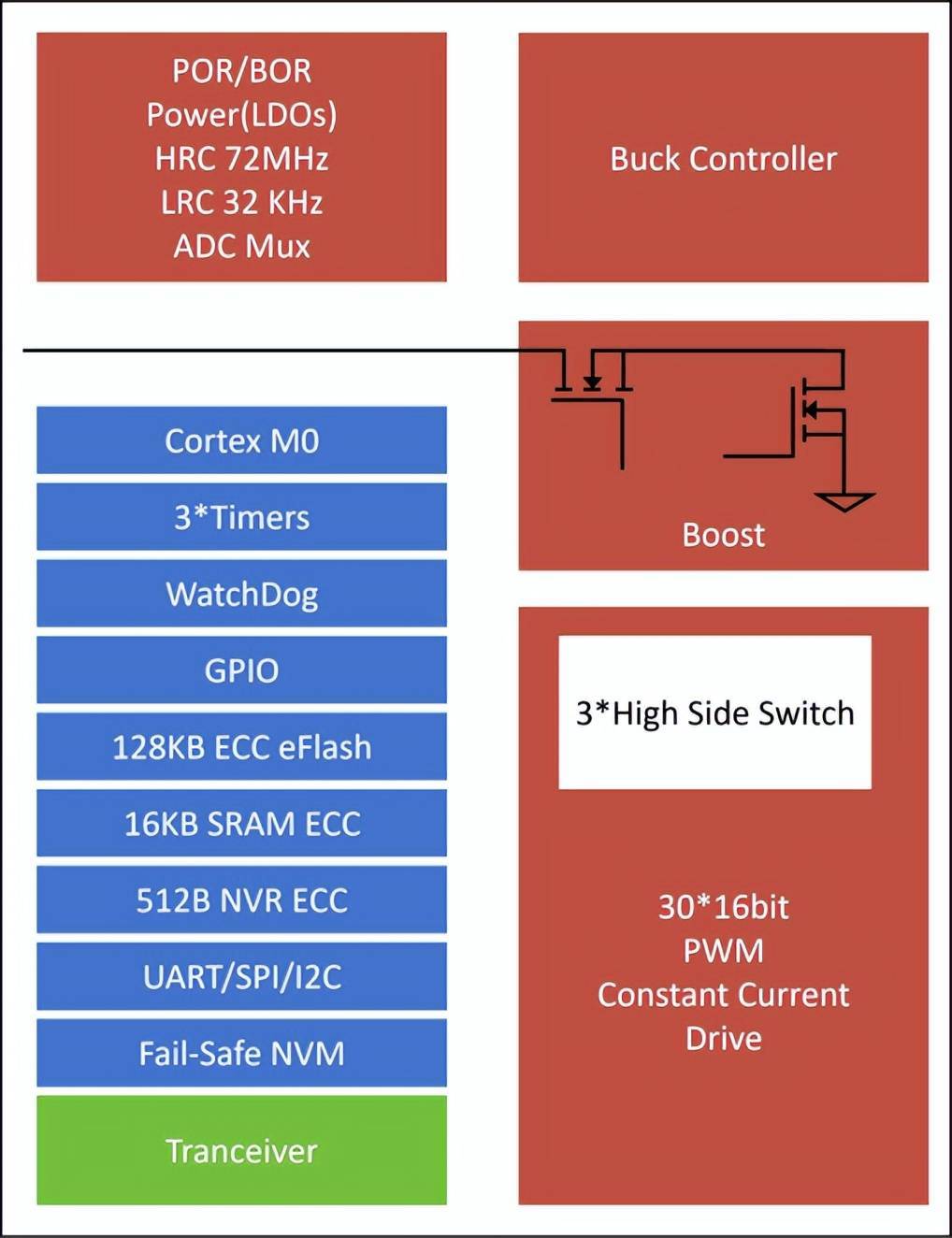 TClux系列创新性地将MCU内核、Flash存储器、LIN/CAN收发器、同步整流Buck控制器、多通道恒流驱动模块 等关键功能集成于单颗芯片中,形成真正意义上的“主控+驱动+通信”一体化解决方案。一颗芯片即可驱动多达48路RGB LED,极大简化了外围电路设计,降低BOM成本与PCB布局难度。